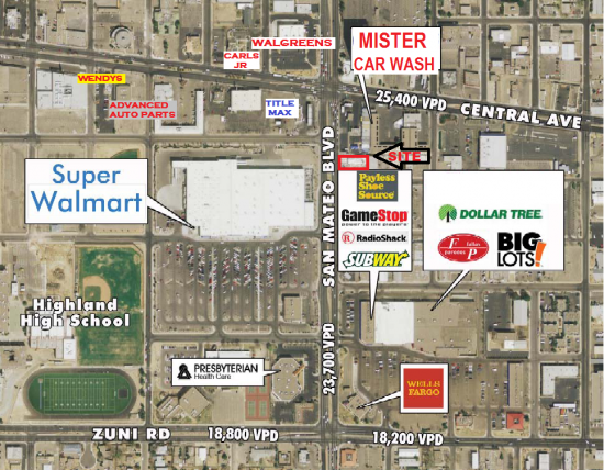High profile C-3 zoned pad site near SEC of bustling San Mateo/Central intersection across from Super Walmart. Great redevelopment opportunity into a variety of retail pad uses.