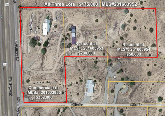 84/285 N to E. Frontage Road. Next right after Ojito Drive (not Court) is the driveway. There is a padlock on gate. You will need to get the combo when you register your showing with Showing Time. Commercial fronts the highway. Follow driveway once inside the gate to see residential and residential land. Property will be on the left.