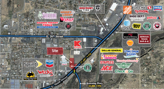 Main Street & Browning Parkway This space offers accomodations for: strip center.