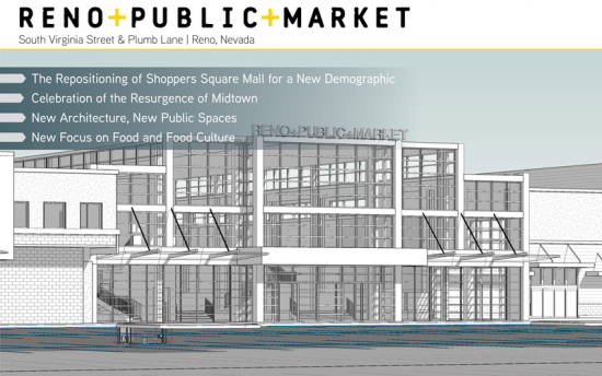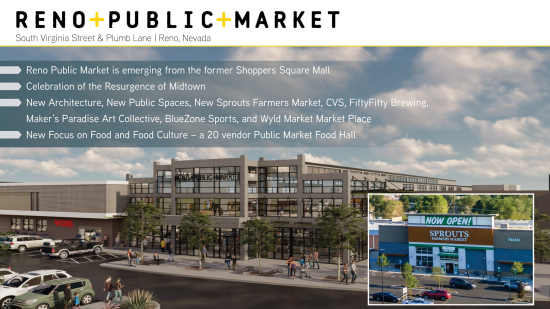 The Repositioning of Shoppers Square Mall for a New Demographic. Celebration of the Resurgence of Midtown. New Architecture, New Public Spaces. New Focus on Food and Food Culture. Embracing RenoÕs food-truck and beer culture, year-round indoor-outdoor common seating, anchored by brewery/distillery taproom and live events stage. A sense of place, where you can find daily needs, shopping from fresh organic groceries, drugstore, pharmacy, and health information to dining, entertainment and the arts.