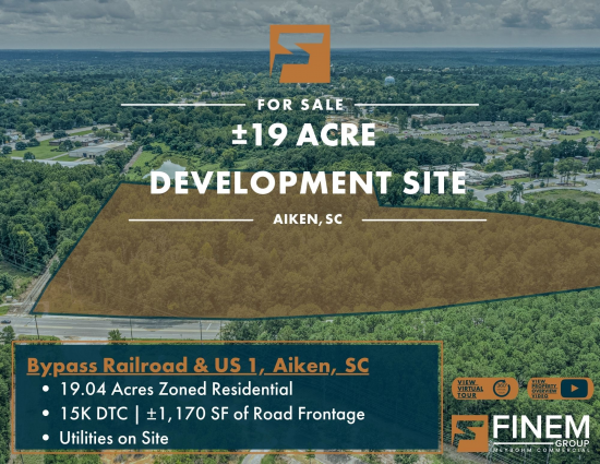 The Finem Team at Meybohm Commercial is proud to exclusively present this 15.02 acre tract of land for sale in Aiken, South Carolina. Being in the City of Aiken and zoned Industrial, this property would be ideal for any industrial development. Utilities are on site: City of Aiken's sewer line runs through the middle of the property, and the water line is at the street. Topography is rolling and the property has a low area in the center through which the sewer line runs. The property could also be rezoned for multifamily or retail development, and with Aiken High School located across the street, a mix of retail and multifamily development could be ideal. This is the northern half of the tract, which is bisected by Rutland Ave. The property has a power line easement running through the northeast border. Rutland Ave has a daily traffic count of 15,700 cars. This space offers accomodations for: industrial.