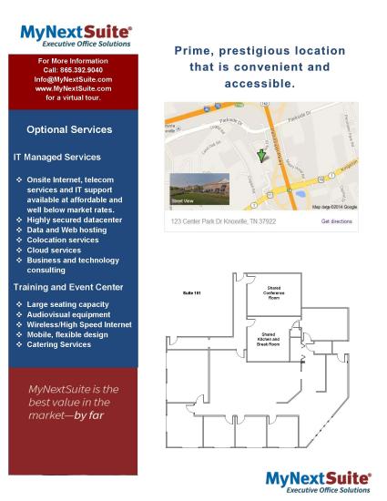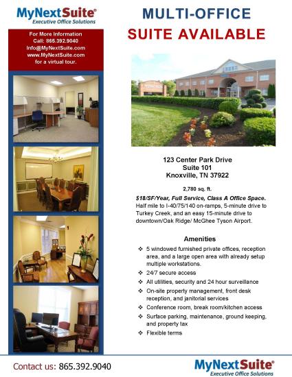 Class A, excellent layout, full service office space, located on Center Park Drive just west of where Pellissippi Parkway intersects Kingston Pike, this property is easily accessible from Kingston Pike or Parkside Drive.