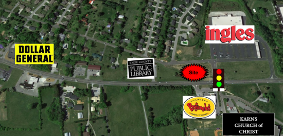 Traffic light corner in Karns Community. This lot is out parceled from the Ingles anchored shopping center, with Oak Ridge Highway frontage. Located in the Knoxville MSA with over 700K population, with 90K in five mile radius, $56K median income, and over 17K cars per day.