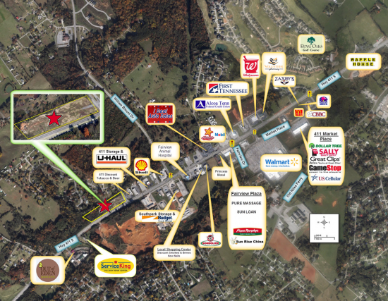 Excellent development land for Retail Center or free-standing retail or restaurant pads. Just south of William Blount Dr. and Walmart Supercenter. All utilities available to the site, including gravity sewer. Will divide (however, price/acre will change)