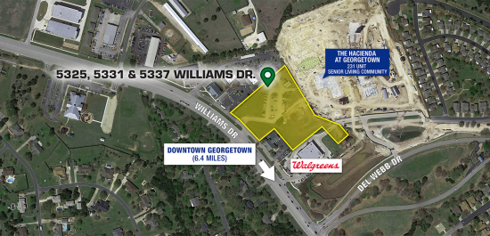 This ideally-located parcel totaling 4.2± acres is set at the main entrance to Sun City Texas, a 4,100± acre Del Webb active adult community in the northwest portion of Georgetown, TX. Situated along Williams Drive, this shovel-ready tract is fully entitled, complete with all utilities and curb cuts in place. Georgetown was recently named by Retirement Places Rated as the “Best Place in America to Retire”. Considerable population and job growth is expected in the immediate area.