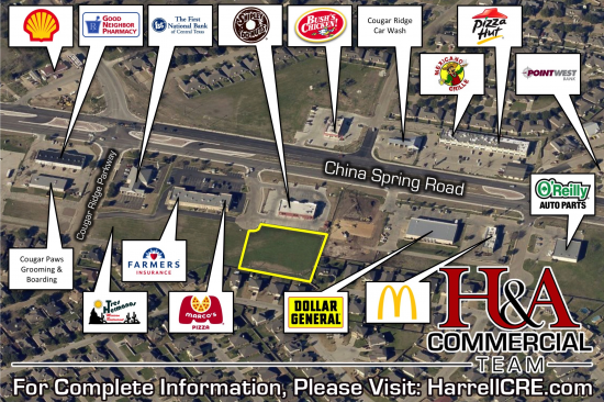Conveniently located off a major road, the 1.348 Acres sits at 10208 Copperleaf Circle in Waco. This parcel is surrounded by several national retailers such as Shipley Donuts, Marco’s Pizza, Dollar General, and McDonald’s to name a few not to mention numerous local vendors. Nearby China Spring Road sees over 10,000 vehicles/day according to a 2016 TxDOT survey and the property is zoned both Waco’s C-2 Community-Commercial and O-3: Office-Limited making this an ideal office and/or retail location!