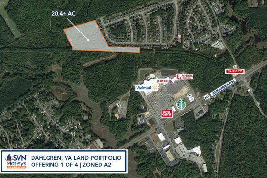 SVN Motleys is pleased to offer 3 parcels totaling 20.4 ± acres as part of an extensive land portfolio in Dahlgren, VA. These properties are zoned A-2, which permits residential use. The minimum lot size is 2 acres with the potential for up to 20 lots or a clustering of townhomes. Ideally situated just off Route 301, the development opportunities abound due to the proximity of the new construction of a 4-lane, $435M bridge connecting Virginia to Maryland slated for completion in 2023. As area density and growth increases, take advantage of lower real estate tax rates than in neighboring Maryland. A bed and breakfast, single family homes or townhomes are several of many options awaiting. This space offers accomodations for: other.